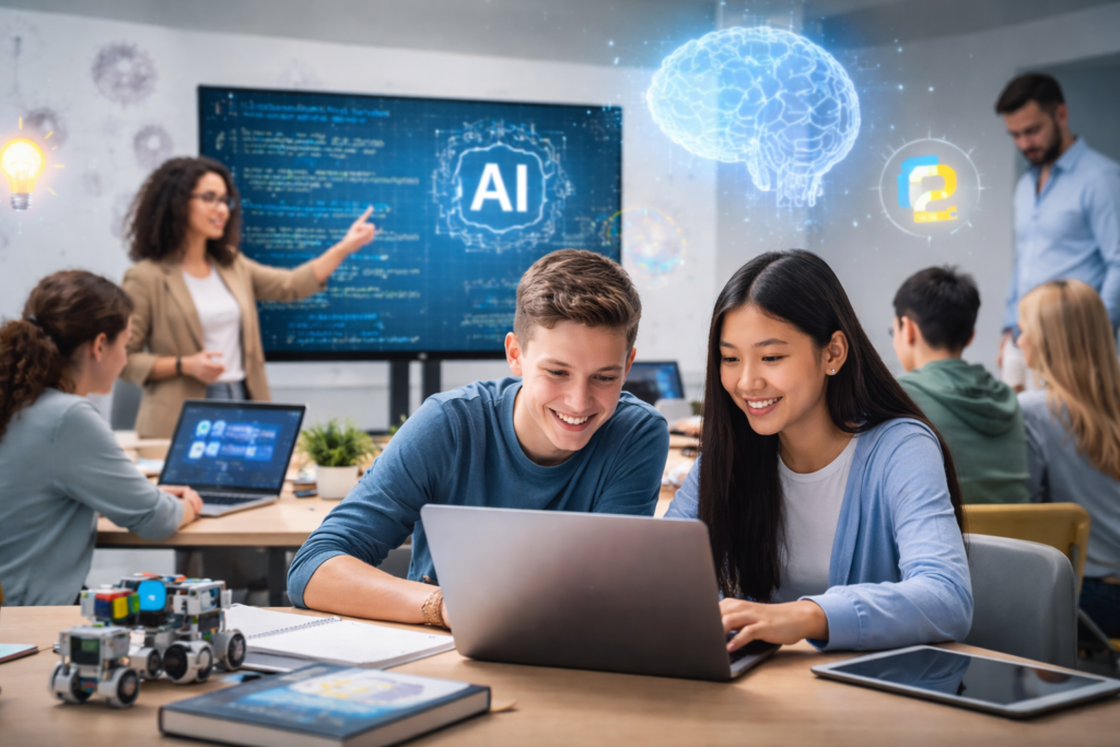 To ensure an age-appropriate experience, the workshop was divided into two groups. Younger participants (ages 10–14) explored AI through interactive, play-based learning. Using a Scratch-based platform, they created simple AI models and observed how a computer can “learn” to recognize patterns. Older participants (15+) went deeper into AI programming with Python. They learned the fundamentals of machine learning and practiced training AI models using the Priscilla platform. The workshop also included sessions on prompt engineering and the use of generative AI in education, aligned with the new teaching approach being developed within the FITPED GAI project.
